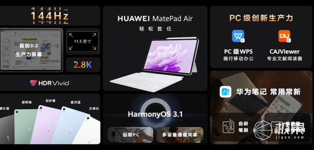 在外观配置上,华为MatePad Air首次搭载11.5英寸3:2长宽比全面屏,拥有P3广色域、2.8K超清分辨率率,Super Motion的新技术加持以及HDRvivid认证,同时它还是华为首款支持最高144Hz屏幕刷新率的平板。