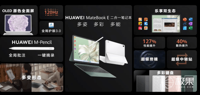笔记本产品压轴的就是这款华为MateBook E二合一笔记本,升级重点突出在PC平板体验的融合。