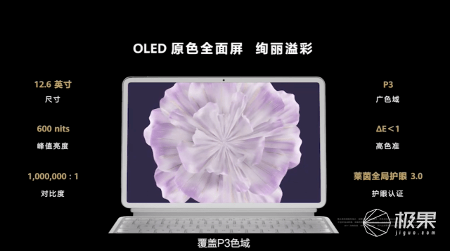 外观配置上,全系采用12.6英寸120Hz OLED屏幕,屏占比90%,覆盖P3广色域,专业级高色准,600尼特亮度,莱茵全局护眼3.0,前800万、后1300万双摄像头。
