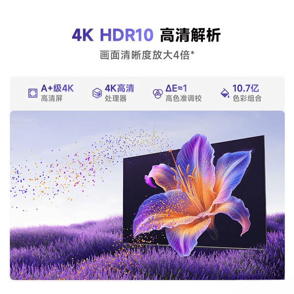 这款电视配备无倒影低反屏技术,结合AG抗光层和纳米级LR低反膜,大幅减少环境光反射和屏幕倒影,即使在阳光直射的客厅中也能保持画面清晰,观看体验舒适不刺眼。75英寸的4K超高清分辨率和HDR10技术,带来细腻丰富的色彩层次,经过ΔE≈1的高色准调校,支持10.7亿色彩显示,画面还原度极高。