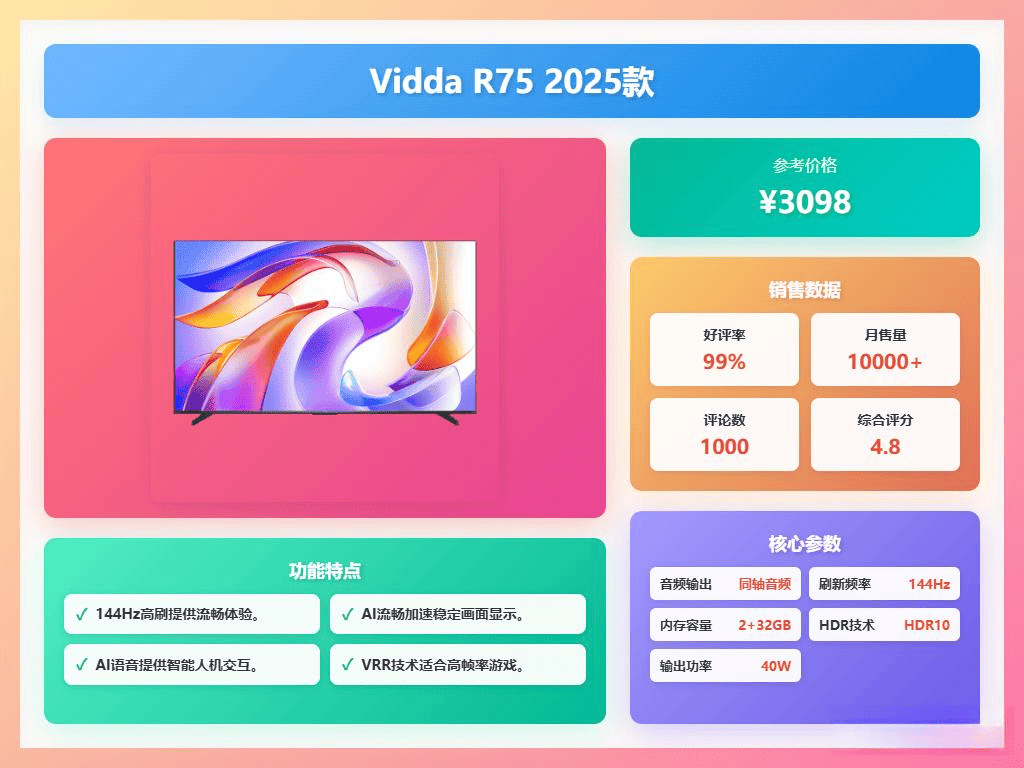 当然,R Pro 75VR1S-PRO的无倒影低反屏技术也非常实用,尤其在光线较亮的环境中,能有效减少屏幕反光,提升观看体验。记住,选电视就像选伴侣,适合自己的才是最好的!