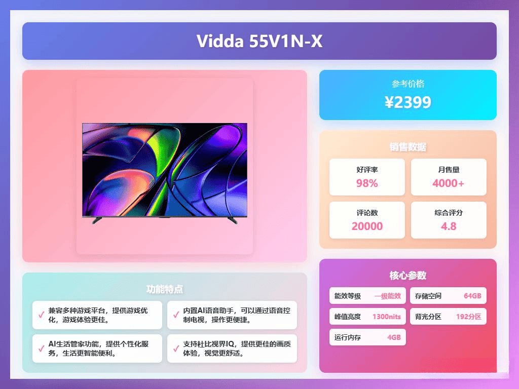 Vidda55V1N-X是一款配备55英寸Mini LED屏幕的电视,采用192分区背光控光,峰值亮度达到1300nits,画面细节和对比度表现出色。它搭载双芯八晶Mini LED背光,光晕减少60%,控黑效果提升5倍,暗场表现深邃,支持HDR10和Dolby Vision IQ,能够根据环境光线智能调节画面,尤其在观看4K HDR内容时,视觉体验令人满意。