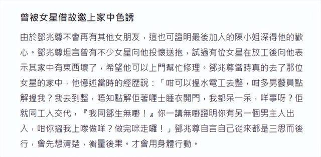 邓兆尊说,刚入行那会儿,有次在录影厂后台准备拍戏,突然过来个陌生人,上来就说有富豪看上他了,愿意出1500万港币,让他陪三个月。