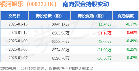 AG娱乐,AG真人,AG平台,AG旗舰厅,AG视讯,AG娱乐平台,真人视讯平台,首存送彩金证券之星消息,1月13日南向资金减持14.8万股银河娱乐(00027.HK)。近5个交易日中,获南向资金减持的有4天,累计净减持64.02万股。近20个交易日中,获南向资金增持的有11天,累计净增持157.68万股。截至目前,南向资金持有银河娱乐(00027.HK)8569.18万股,占公司已发行普通股的1.95%。