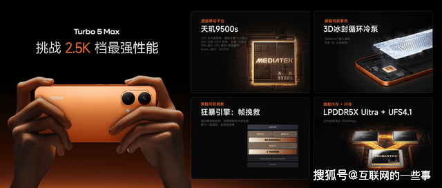 Turbo 5 Max 全球首发天玑 9500s,采用 3nm 制程工艺,第二代全大核架构设计,内置 8 核1+3+4三簇全大核 CPU 和 12 核 GPU。CPU 缓存 + 系统缓存达 29MB 超大规模,晶体管数高达近 300 亿,是真正的满血正代旗舰芯,实测安兔兔 V11 跑分超 361 万。