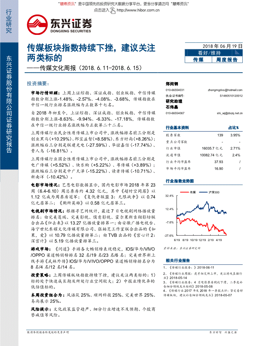 本次权益分派前公司总股本为232,943,924股,权益分派后总股本增至326,121,493股;【探路者】首次股份回购:公司通过股票回购专用证券账户以集中竞价交易方式回购公司股份2,375,036股,总金额为人民币10,927,834.72元(不含手续费),本次回购占公司总股本的比例为0.2665%,最高成交价为4.65元/股,最低成交价为4.52元/股;【骅威文化】提供担保:公司拟为全资子公司浙江梦幻星生园影视文化有限公司申请银行综合授信(流动资金贷款)提供担保,金额不超过1.1亿元人民币,期限为本次董事会审议通过后一年之内,用途主要是其为子公司经营需要或业务拓展的备用授信;【冰川网络】现金管理:截止本公告日,公司已如期赎回中信银行股份有限公司深圳分行中信理财之共赢利率结构19185期人民币结构性理财产品(C183Q0185),赎P18东兴证券行业周报传媒行业:传媒板块指数持续下挫,建议关注两类标的 回本金1,000.00万元及理财收益126,575.34元,符合预期收益,本金及收益均于2018年6月15日到账;【天神娱乐】跟踪评级变动:鹏元资信评估有限公司对公司及公司已发行的“大连天神娱乐股份有限公司2017年面向合格投资者公开发行公司债券(第一期)”的信用状况进行了跟踪分析,将评级展望调整为负面;【捷成股份】提供担保:公司之全资子公司北京极地信息技术有限公司因实际生产经营需要,拟向北京银行股份有限公司北清路支行申请500万元的综合授信,公司计划为极地信息的上述银行授信提供连带责任保证担保,本次担保金额为500万元;【盛天网络】延期股权购回:公司控股股东赖春临女士就其已质押的4,350,000股股票与中泰证券办理了延期购回交易,延期购回日为2019年6月13日。