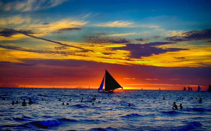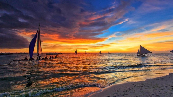 日落风帆—— 菲律宾 长滩岛 S1/S2/S3区域可以看到夕 阳西 下,因此到了落日的时候,可以走到沙滩体验一把落日帆船的魅力。落日帆船是纯风力的帆船,没有任何机械动力,完全凭着风速前进,坐在船上,看着太阳慢慢的低于远处的海平面,此景永远的刻在记忆里。(建议大家穿好出海装备,海水很容易打到身上,100%会湿,特别是电子产品,需要带上防水套)。不过夕阳下的海水温度如同温水一般,拍打在身上也不觉得冷,还有晚霞可以欣赏。