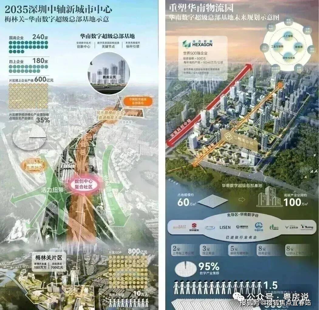(1)梅林关|“深港科技中轴”重要战略支点,近700亿投资梅林关是以交通枢纽、产业集群、商业核心与科教人文为战略规划的世界级“中央活力生活区”,2024年10月,龙华区正式官宣:梅林关片区将全面对标纽约哈德逊城市广场、巴黎拉德芳斯区,打造一座“垂直立体的轨道上盖之城”,总投资规模近700亿元,由中建三局集团有限公司深度参与整体开发运营,将梅林关打造为“大湾区数字经济核心引领区、数字科创先锋示范区”,改造范围约4.63平方公里,预计新增开发量180万平方米,推动片区年总产值突破1500亿元,创造近6万个高端就业岗位