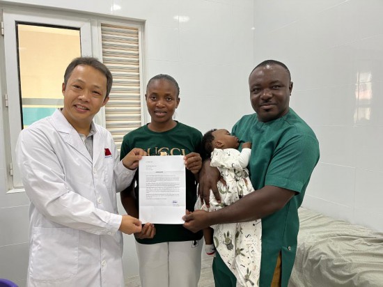 10月21日,胆囊结石患者塞西莉亚(中)及家人为第14批中国援加纳医疗队队长杨永光(左)送上感谢信。新华社发(第14批中国援加纳医疗队供图) 新华社阿克拉10月28日电 通讯|中国医疗队用微创手术治愈加纳患者 新华社记者高剑飞 “这太不可思议了!困扰了我三年的疼痛,中国医生只开了几个小孔就给解决了。
